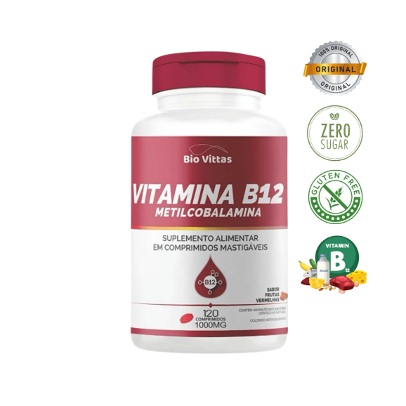 A Vitamina B12 na forma de Metilcobalamina é a forma ativa e biodisponível da B12, essencial para o bom funcionamento do sistema nervoso, produção de energia e formação de células do sangue. A fórmula da Bio Vittas vem em comprimidos mastigáveis com agradável sabor de frutas vermelhas, ideal para quem busca praticidade e eficácia.
